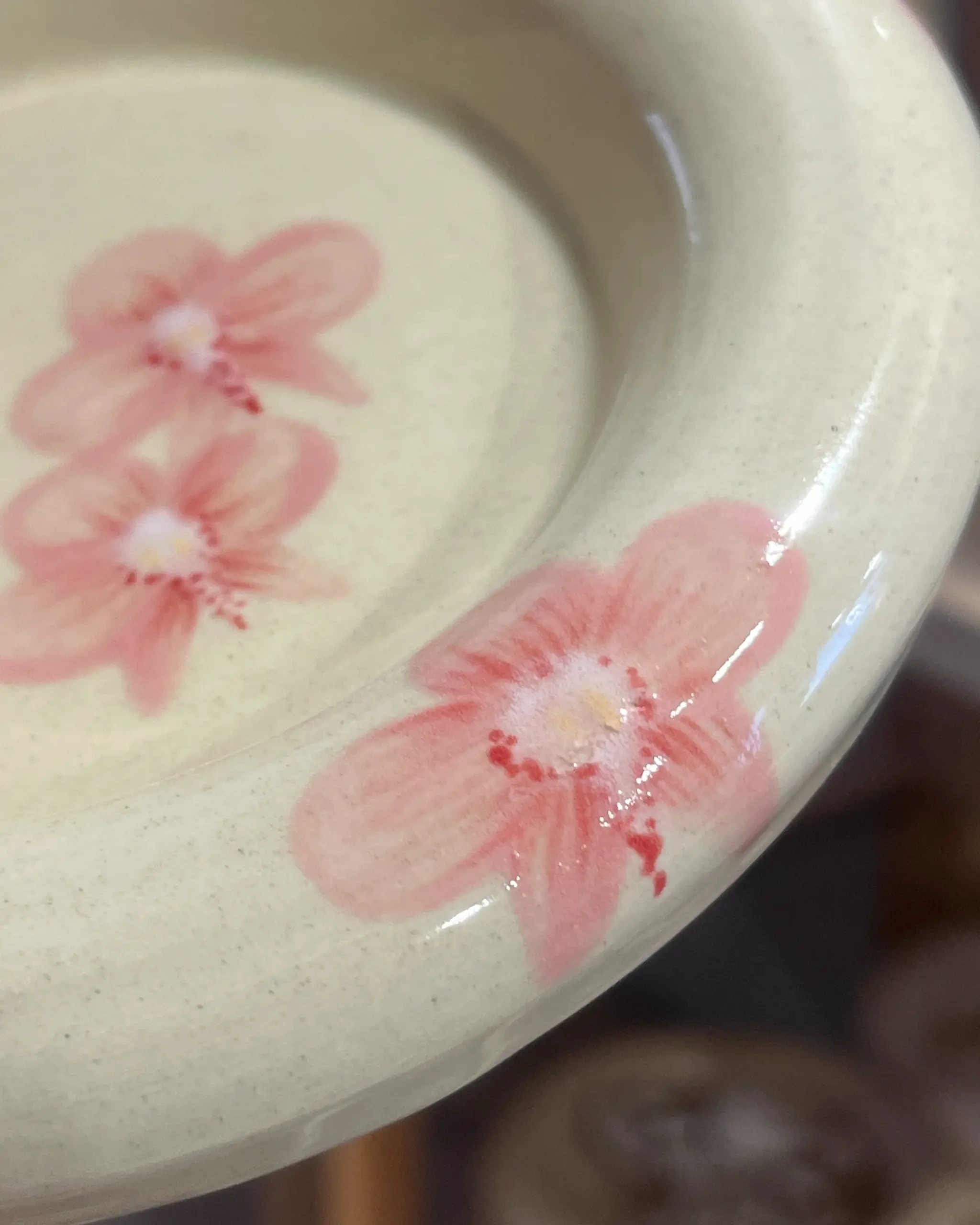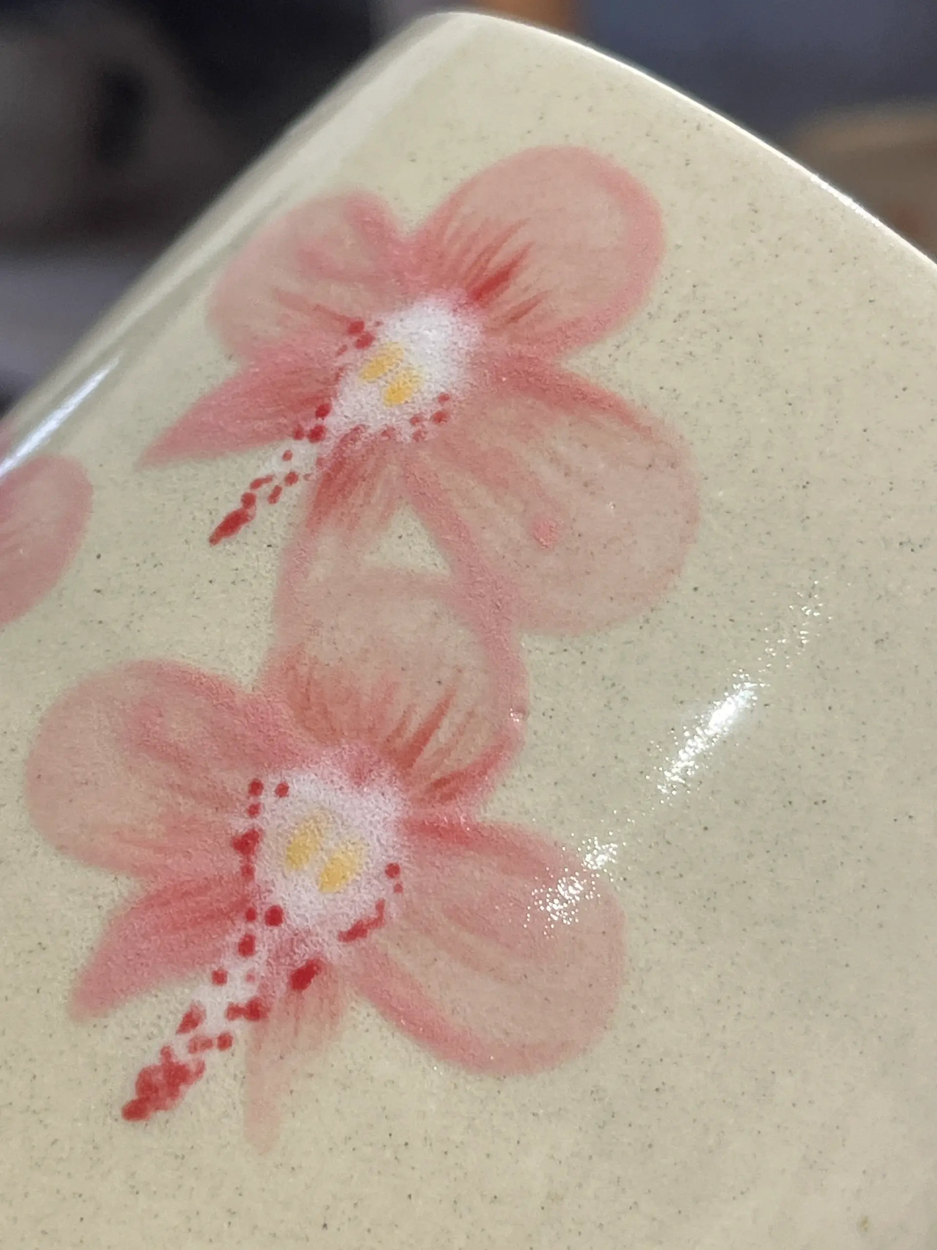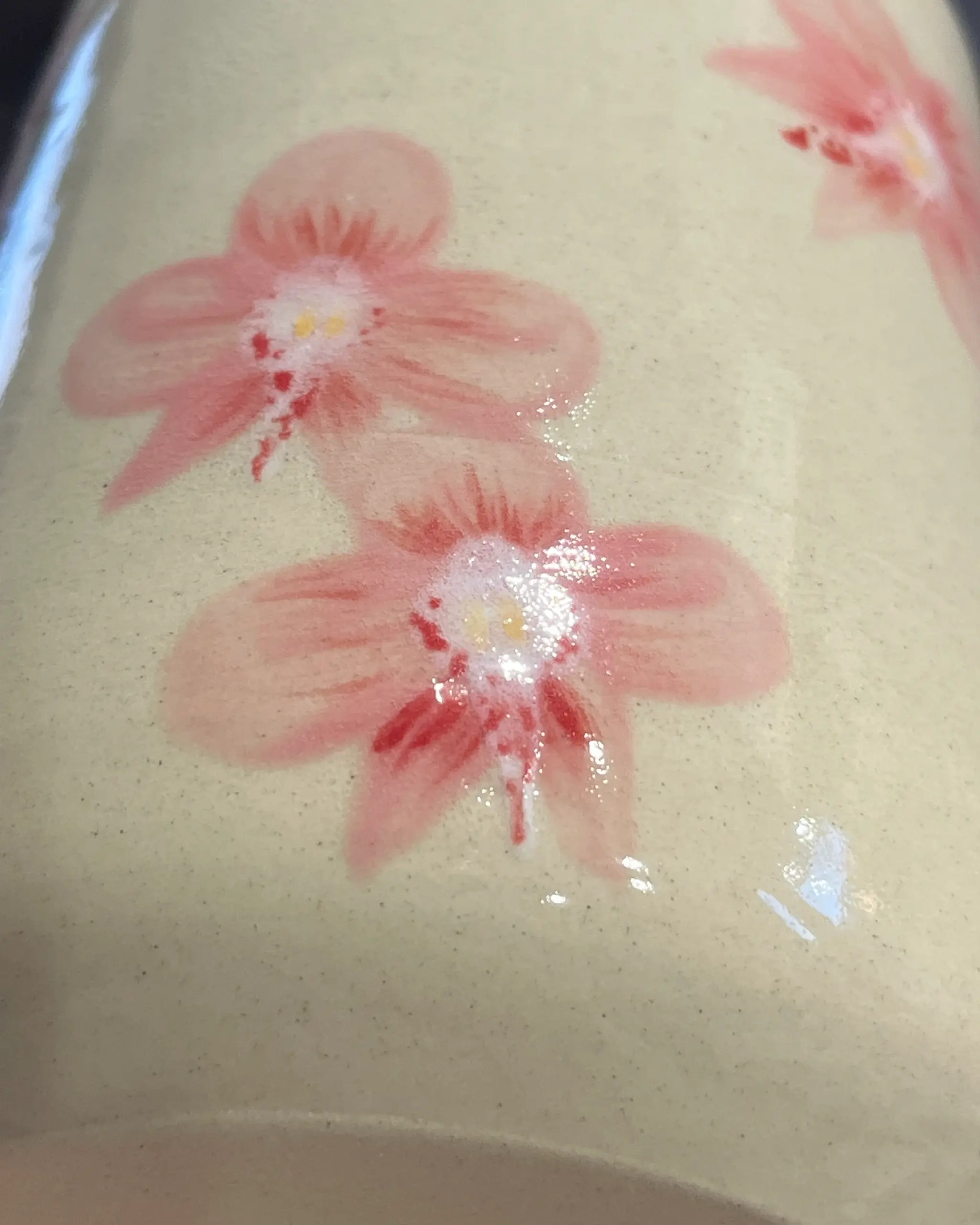 Defekt: rozchodząca się farbka na kwiatkach oraz miejscami brak szkliwa (mikro kropeczki z ubytkami)