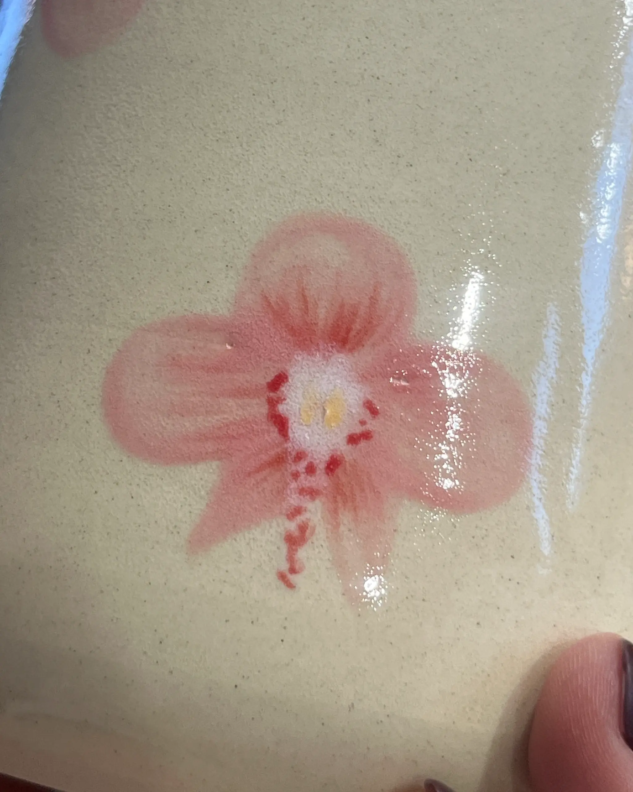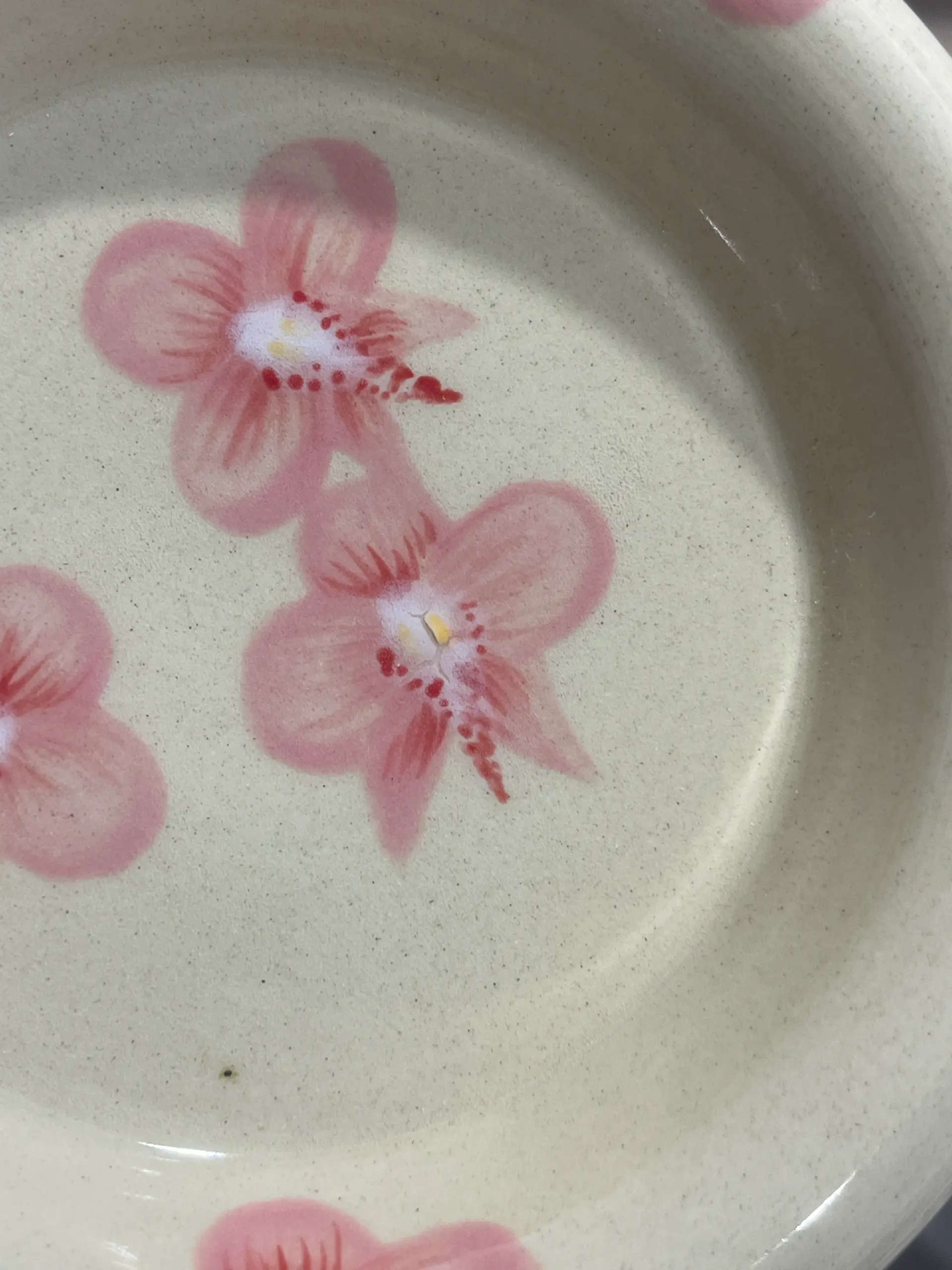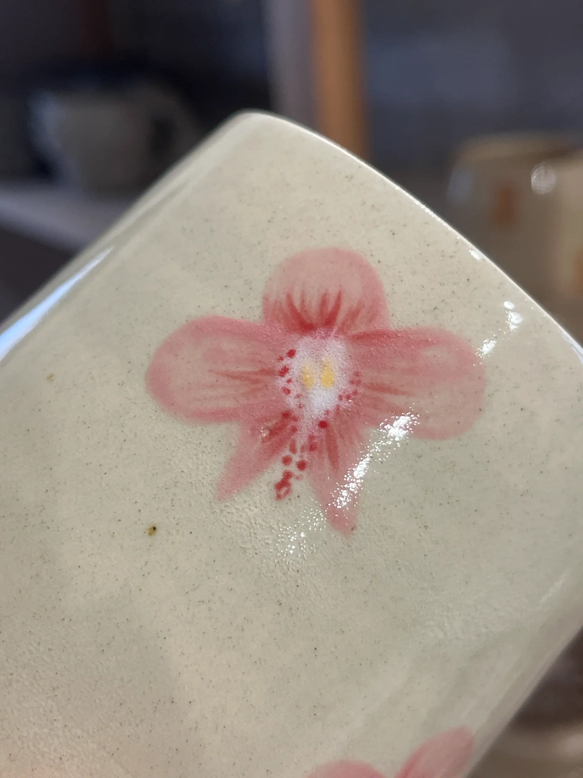 Defekt: rozchodząca się farbka na kwiatkach oraz miejscami brak szkliwa (mikro kropeczki z ubytkami)